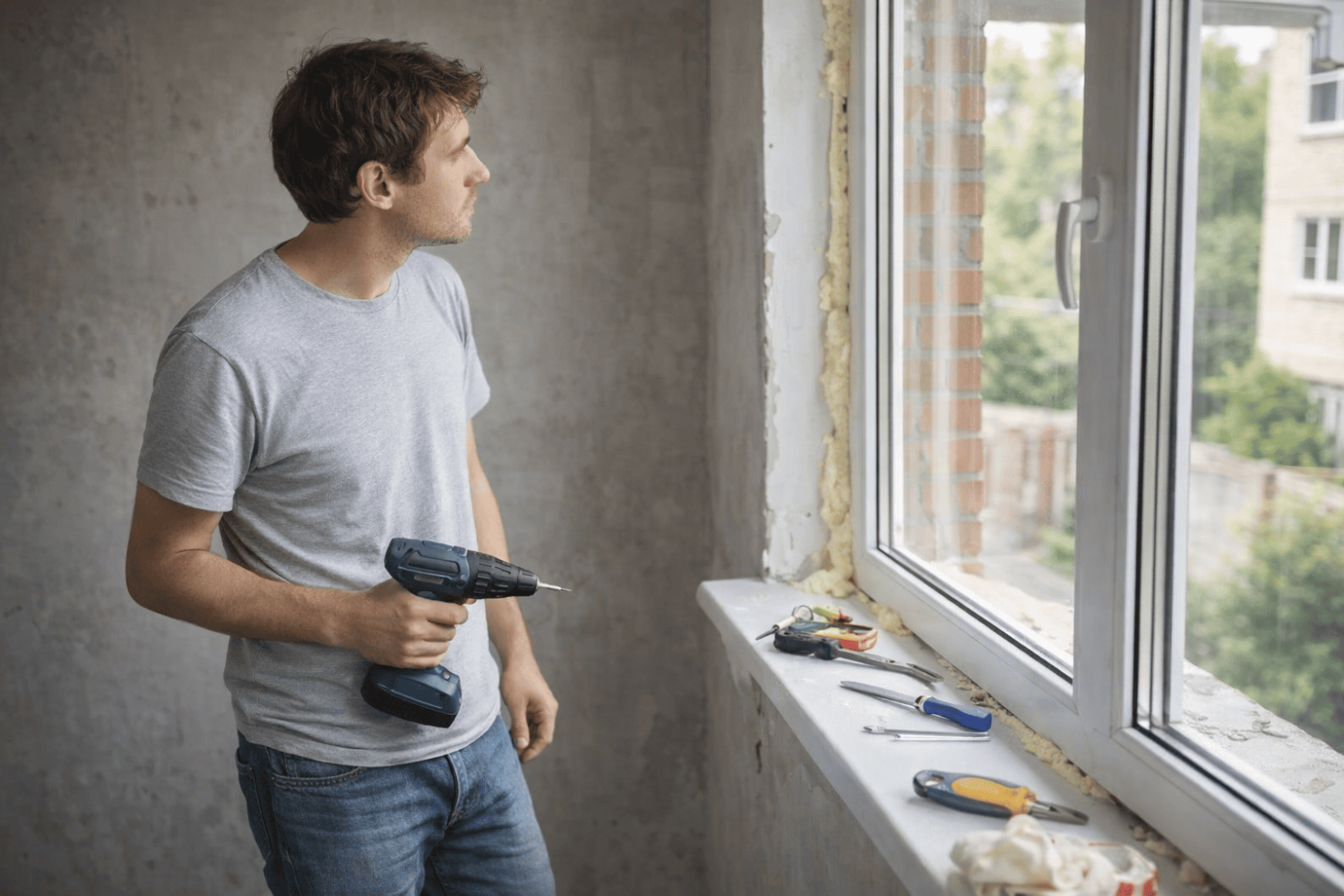 конструкции в оконной cистеме РЕХАУ BLITZ; ручка белая пластиковая стандарт (Россия); подоконник ПВХ белый, 250 мм; монтаж базовый с изоляцией наружнего шва; отлив белый, 150 мм; подставочный профиль; откосы белые (сендвич-панель), 200 мм; подготовка проема и монтаж откосов; доставка с разгрузкой.